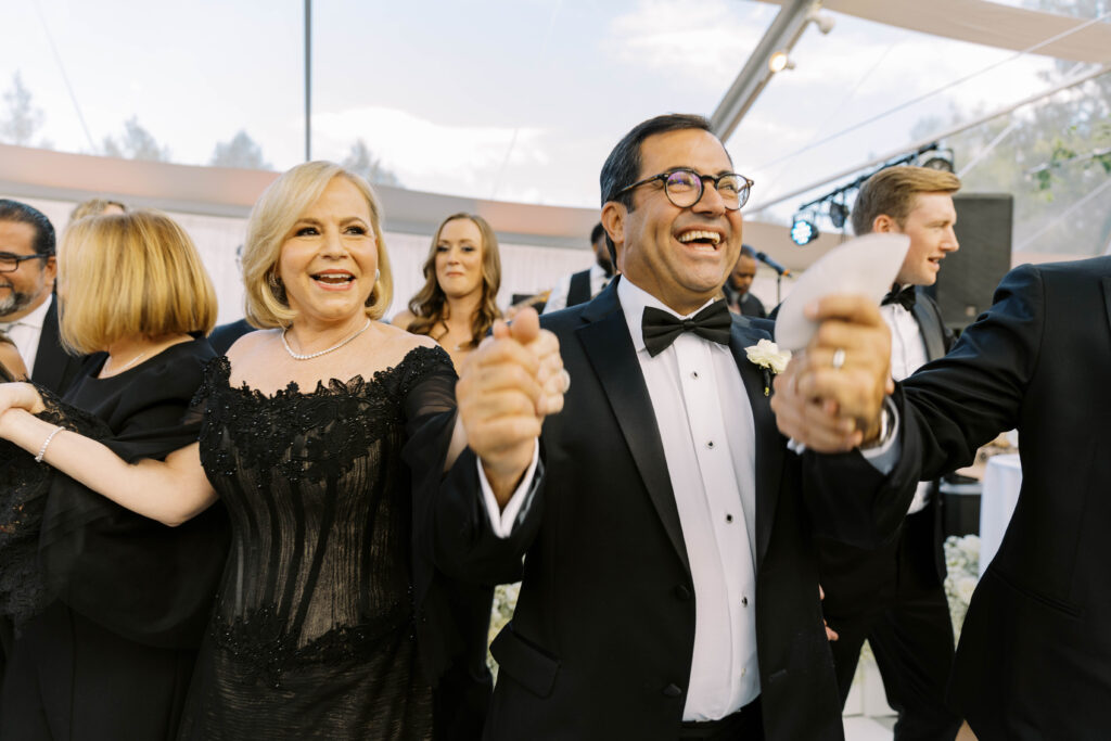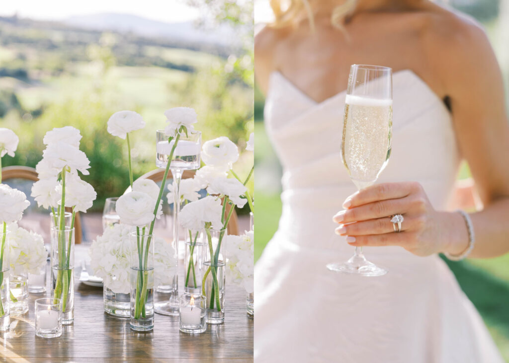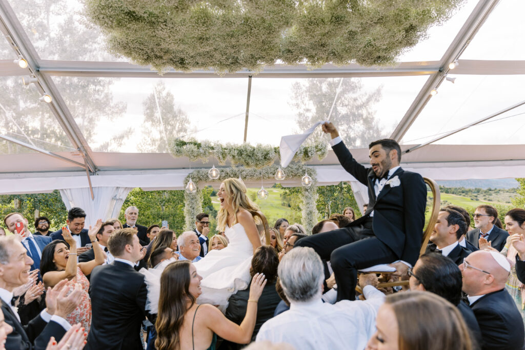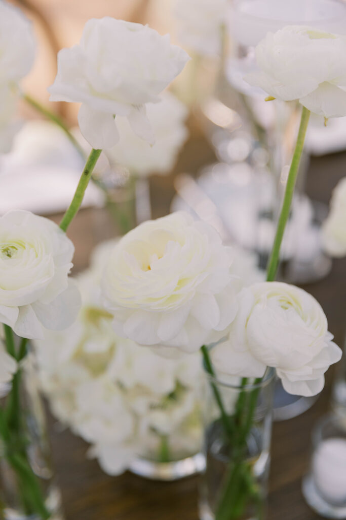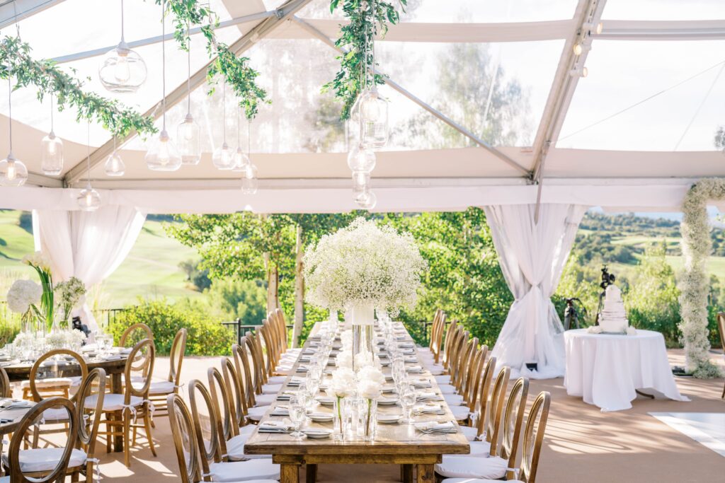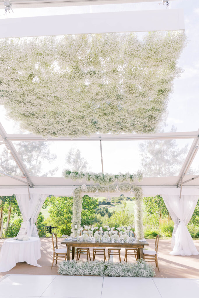 Surrounded by beautiful baby’s breath and all-white blooms, this monochromatic wedding is the perfect inspiration for the timeless bride. The elevated clouds of baby’s breath and hanging floral installations in the clear-top tent created an extravagant romantic ambience.